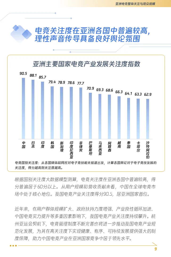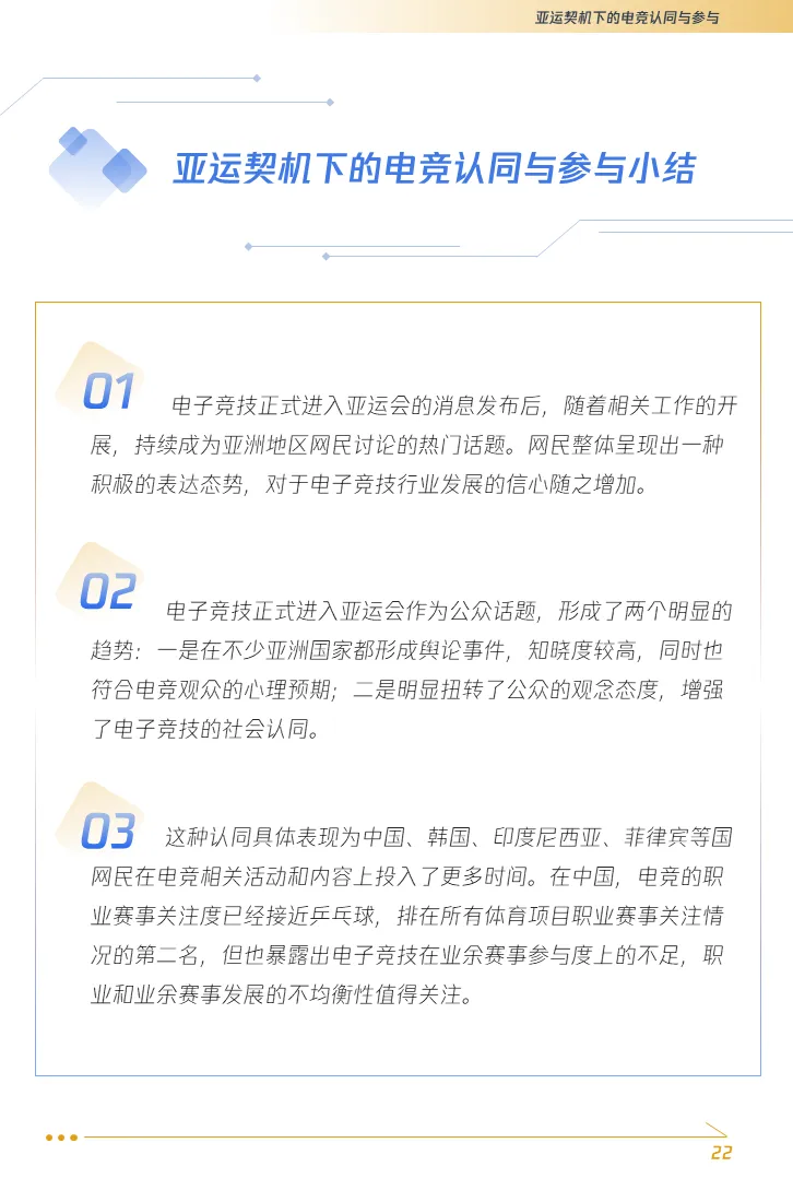 1. “电竞入亚”话题推高亚洲国家民众知晓度,增强了电子竞技的社会认同。借由亚运会的筹备,中国电子竞技正在持续进行一场规范化的深刻迭代,在体育发展路径上由虚向实、从松散走向规制。