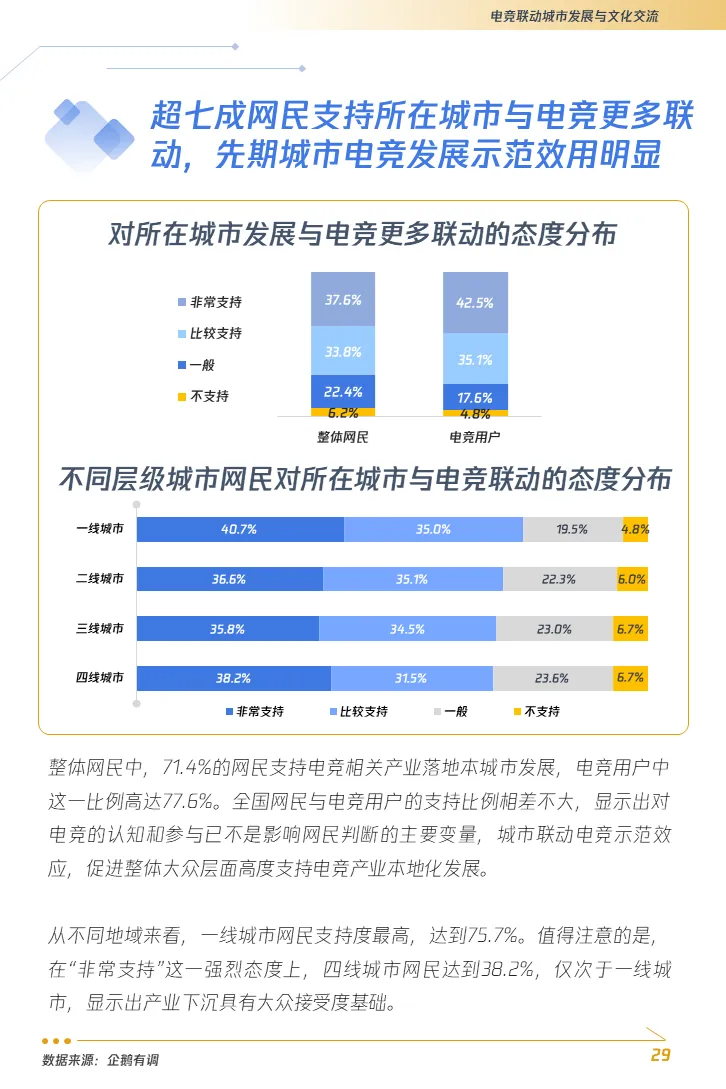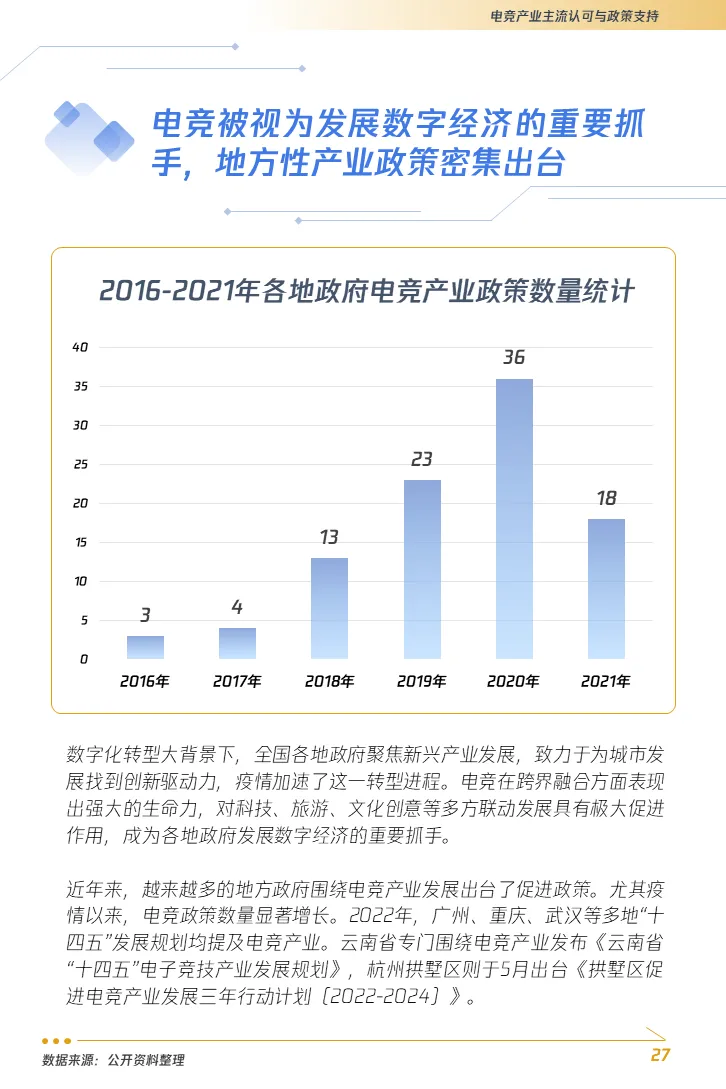 4. 电竞产业与城市发展展现出极高的契合度,地方政府短线试水转向长线布局。电子竞技正从一个基于竞赛表演的文化体育产业升级成为拥有复合社会价值的产业,产业基础设施的全面升级也将随之而来。