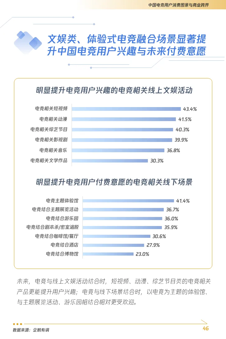 3. 电竞产业多元融合发展潜能不断释放,推动新经济新消费前景可观。电子竞技赛事正逐步摆脱游戏市场行为,以丰富的线上线下场景为依托,给观众提供了更好、更丰富的消费服务体验。