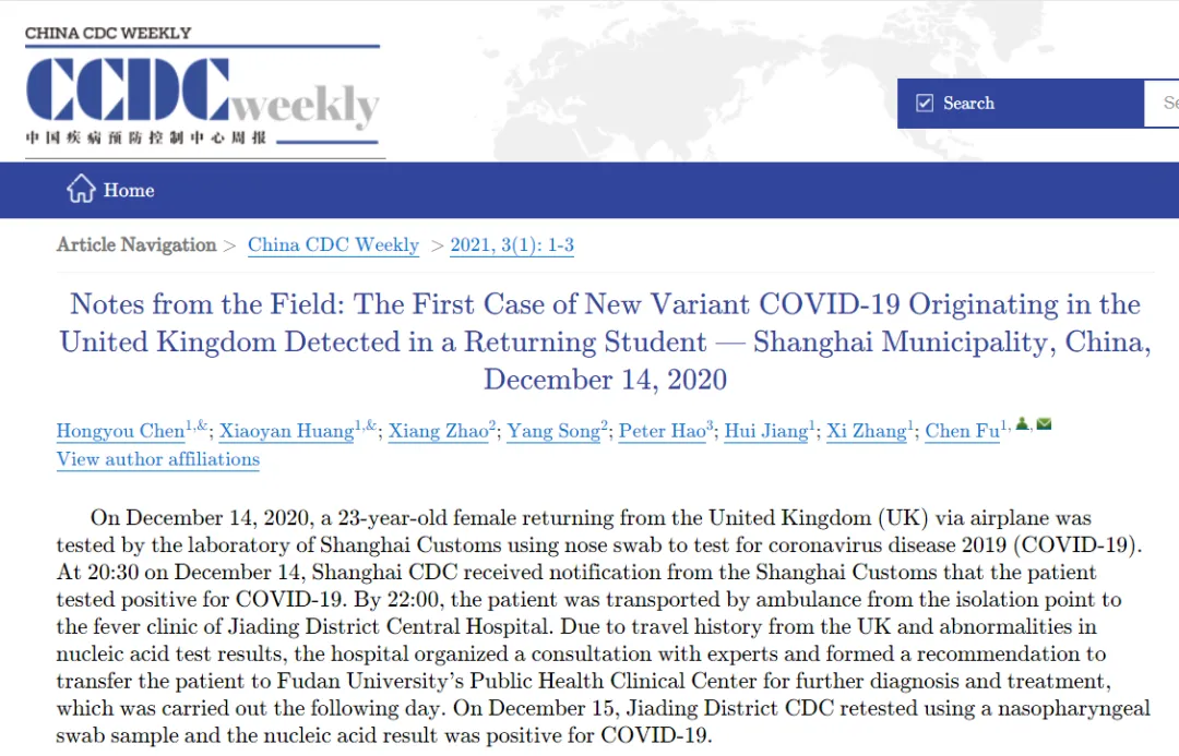 据报道,《中国疾控中心周刊》研究报告显示,该病例是一名23岁的女学生,近期从英国乘飞机返回上海,12月14日检测出新冠病毒呈阳性,当晚被转移到医院隔离。