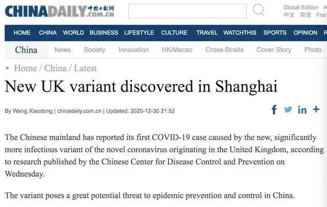 据《中国日报》报道,根据中国疾病预防控制中心2020年12月30日发表的研究报告,中国大陆首次报告了最初在英国发现的变异新冠病毒感染病例。
