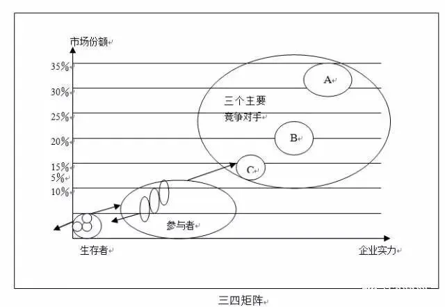 “三四规则”只是从经验中得出的一种假设,它并没有经过严格的证明。但是这个规则的意义非常重要,那就是:在经验曲线的效应下,成本是市场份额的函数。倘若两个竞争者拥有几乎相同的市场份额,那么,谁能提高相对市场份额,谁就能同时取得在产量和成本两个方面的增长;与所付出的代价相比,得到的可能会更多。但是对市场竞争的领先者而言,可能得到的好处却反而少了。然而在任何主要竞争者的激烈争夺情况下,最有可能受到伤害的却是市场中最弱下的生存者。