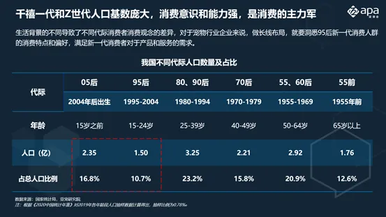 从消费者来看,目前我国80/90后人数达3.25亿,占总人口的23.2%,这部分人是职场主力,有经济基础,消费能力强,是社会的中坚力量;95后人数达3.85亿,占总人口的27.5%,这部分人群作为互联网数字原住民,从小在富足的环境中长大,自我意识强烈,多为颜值派,敢于尝新,是未来消费的主力军。生活背景的不同导致了不同代际消费者消费观念的差异,对于宠物行业企业来说,做长线布局,就要洞悉95后新一代消费人群的消费特点和偏好,满足新一代消费者对于产品和服务的需求。