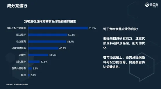 宠物主在选择宠物食品时,原料及配方是其当下最为关注的因素,占比高达92%,远超其他影响因素,说明了现阶段宠物主在选择产品时对原料和配方的关注,多成分党。对于宠物食品企业的启发是,要提高自身研发能力,在生产和宣传产品特点时,要注重优质原料和配方的使用和打磨。