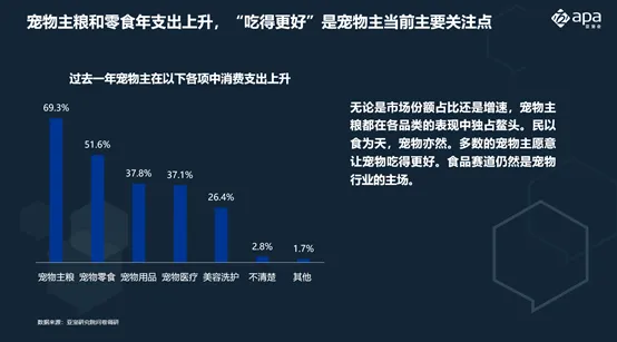 过去一年,宠物主在宠物各项消费上支出增加最多的类目是宠物主粮,占比达69%,其次是宠物零食(52%)。说明让宠物吃得更好,是当下宠物主最关注的点。此外,宠物用品和宠物医疗支出上升也较为显著,分别为38%、37%。无论是市场份额占比还是增速,宠物主粮都在各品类的表现中独占鳌头。民以食为天,宠物亦然。多数的宠物主愿意让宠物吃得更好。食品赛道仍然是宠物行业的主场。