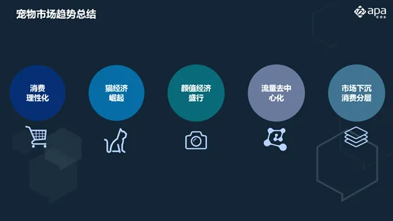 目前宠物消费市场呈现消费理性化、猫经济崛起、颜值经济盛行、流量去中心化、市场下沉消费分层等趋势。