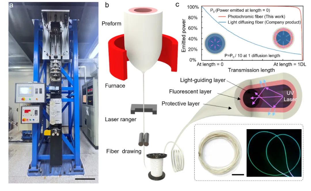 近日,南京大学陆延青教授和华中科技大学陶光明教授合作,在可穿戴、多色交互式光致变色纤维领域取得了新进展。科研团队基于可量产的多材料纤维预制棒热拉制法实现了一种高柔性、均匀发光且可在广色域范围内进行调控的光致变色纤维。由于市面上基于波导式的发光纤维是通过引入人造结构缺陷来破坏光纤的全反射条件从而使纤维漏光,无法保证传输方向的发光均匀性。而该团队在聚合物光纤基础上引入荧光材料调控纤维对外辐射光谱,同时利用荧光材料的饱和效应,实现了纤维通体均匀发光。该研究团队还通过对纤维结构的优化设计,实现了基于RGB三原色混色机理的单纤广色域调控。最后,研究团队将该可控式光致变色纤维集成在多种可穿戴交互界面上,利用日常服饰实现了在情感、通讯等方面的多元化交互,为人机交互手段提供了全新的实现途径。有望在通讯、导航、医疗保健、可穿戴、物联网等领域给人类的生活方式带来全新变革。视频1|本研究的可穿戴、多色交互式光致变色纤维整体概述纤维作为人类历史上应用最久远的可穿戴材料,由于其自身出色的透气性与柔性能够对人体的3D不规则外形实现近完美适配,是目前较为理想的可穿戴器件基材。发光纤维作为功能纤维领域的一种交互、可视化手段,打破了传统交互界面刚性、硬质的特点,有望成为一种新兴的交互界面。目前已经实现产品化的发光纤维是基于波导原理的聚合物光纤(名词解释),这种光纤利用人造结构缺陷或材料缺陷来破坏光线在光纤内部的全反射条件从而造成纤维内部光线发生泄漏。受到光纤传输损耗的限制,该光纤在传输方向无法保证发光亮度的均匀性,并且由于缺陷在纤维周向上的非对称性,其无法保证纤维周向亮度的一致性,极大限制了其作为线光源应用的场合。本文受到光致变色纤维与聚合物光纤的启发,基于热拉制法对纤维结构进行并行设计,提出了一种实现批量化制备的可穿戴、多色交互式光致变色纤维。(1)基于工业级热拉制制备方法,将多种功能材料集成在单根纤维内部进行一体化成型,克服了现有波导式发光纤维沿传输方向亮度非均匀的缺陷。为了解决波导式发光纤维在传输方向上发光不均匀的问题,研究团队通过对纤维内部波导结构的设计,使得纤维内部紫外光进行全反射的同时,利用集成在纤维内部荧光复合材料的波长转换效应,实现了紫外波段转化为可见光波段的发光,并利用荧光复合材料的荧光饱和效应确保在传输方向上发光的均匀性。研究人员通过理论计算对纤维结构尺寸进行扫参分析,得出光源耦合效果最佳的尺寸参数及其损耗规律,并且通过光线追踪的方式定量探究了不同紫外功率下纤维沿长度方向的亮度变化趋势,证明了光致变色纤维发光亮度的均匀性。团队基于工业热拉制工艺对光致变色纤维进行数百米级别的大批量一次性制备,克服了传统发光纤维制备周期长,有效长度短,研发成本高等缺陷。
