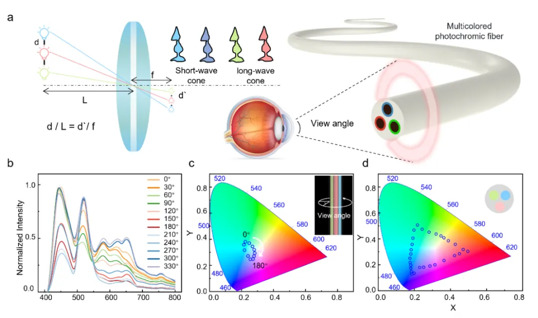 图1|光致变色纤维的制造过程。a 光致变色纤维工业规模生产线的实物图。b 光致变色纤维的制造示意图,插图显示的是光致变色纤维实物照片。c 本工作与商业产品(光扩散光纤)在传输方向上的发光衰减比较(2)打破了传统发光纤维的色彩局限性,利用RGB的三原色混色机理实现了单纤的广色域调控。得益于热拉制工艺对纤维内部结构的可设计性调控,研究团队将多根导光芯层与不同颜色的荧光材料封装在单根纤维内部,仿照RGB三原色的混色原理实现了单根纤维的多色系调控。由于多芯纤维内部结构的非对称性,该纤维在周向不同方向上的光谱辐射强度会发生变化。针对不同的观测视角,纤维对外的整体显色情况不同。研究者基于视觉细胞的成像方式,对多芯纤维的周向辐射强度进行理论计算,通过优化多芯纤维包层尺寸及导光芯层间距来优化纤维周向观测辐射色差,使其在不同视角下观测的颜色尽量保持一致。此外,研究者利用多芯纤维内部多导光芯层可分段单独控制的特点,通过调控耦合芯层的光源亮度比使纤维显色达到了更广的色域范围。