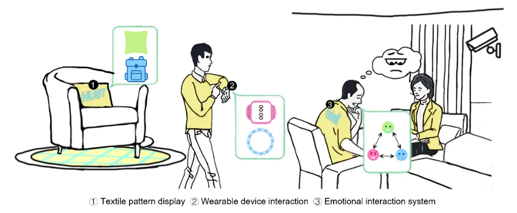 图3|光致变色纤维系统的应用场景展示研究团队将性能稳定的电容感知纱线与导光变色纤维混编在日常服饰中,设计了一个集感知与发光交互功能结合的可穿戴应用产品,为现在智能纺织品的多模态集成提供了一种新思路。此外,研究团队将多种色系的导光变色纤维混编在日常服饰上,搭配图像采集器件与控制芯片构建了一个简易的情绪识别交互场景,用以证明光致变色纤维作为辅助通讯技术工具的可行性。团队还利用光致变色纤维良好的耐磨性与鲁棒性将其集成在汽车内饰地毯及水下内饰物品上,证明了其应用场景的普适性。视频3|可穿戴情绪识别交互反馈系统,可根据用户的面部表情反映其当前的情绪状态该文章近日发表在国际顶尖学术期刊《Light: Science & Applications》,题为“Wearable and Interactive Multicolored Photochromic Fiber Display”,华中科技大学博士生李攀、硕士生王瑜伟、电子科技大学博士生贺晓娴为论文的共同第一作者,南京大学陆延青教授、华中科技大学陶光明教授为论文共同通讯作者。合作单位还包括新加坡国立大学、东华大学、北京服装学院、武汉音乐学院等。该工作得到了国家重点研发计划、国家自然科学基金、华中科技大学交叉研究支持计划等项目的支持。