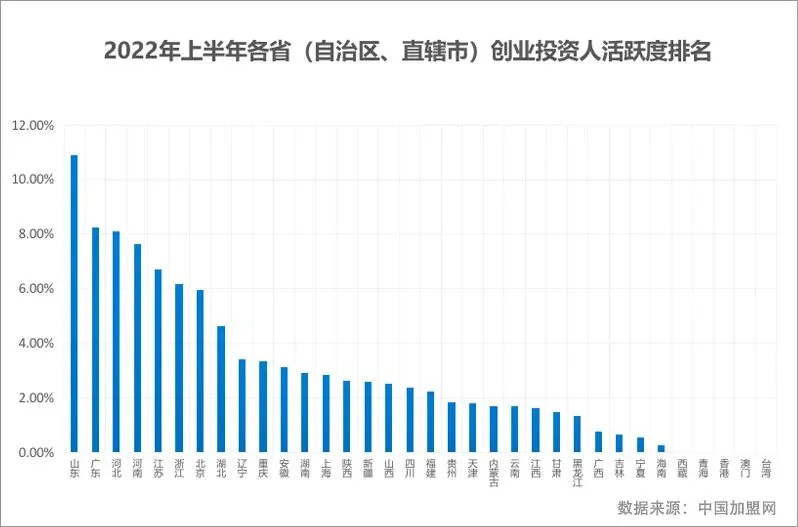 从2022年上半年创业投资人各省(自治区、直辖市)分布来看,创业投资人活跃度较高的省份分别为山东省、广东省和河北省,占比分别为10.88%、8.25%%和8.10%。
