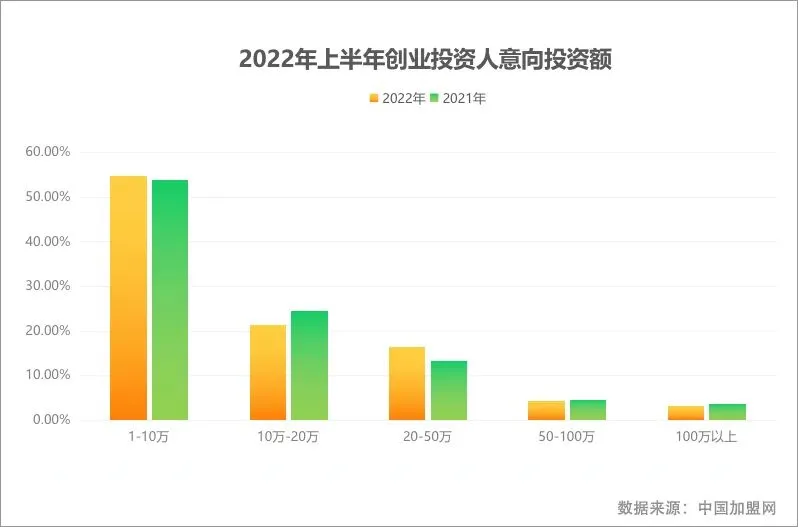 2022年上半年,创业投资人投资意向金额最受关注的集中在1万-10万,10-20万和20-50万。关注50-100万及100万以上投资项目的人群减少。疫情之下,经济环境下行,对于大额的50万以上的开店投资项目,创业投资人更加谨慎,不敢贸然冒风险,对市场都持有观望的态度。