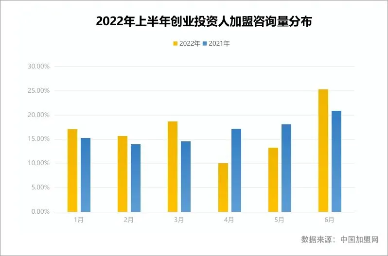 从加盟项目咨询情况来看,2022年上半年创业投资人的创业热情骤减,加之各地疫情防控政策的限制,使得外出考察受限,这就导致了很多连锁品牌加盟业务发展放缓,从数据中我们不难看出,1月、2月、3月,创业投资人的活跃度与往年差距不大,到了4月、5月活跃度下降明显,随着6月国内疫情得到有效的控制后,这一数据开始快速攀升。