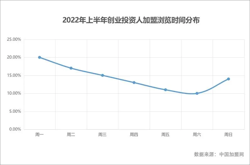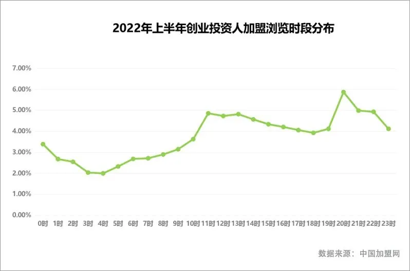 2022年上半年,选择通过移动端表达加盟需求的创业投资人占比达到90%,说明手机已成为创业投资人找项目的主要工具。而在每日浏览看项目的时间上,我们发现每周一创业投资人的活跃度最高,这表明创业投资人在每周一浏览看项目的时间更为集中,而在具体的浏览时间段上,每日晚间20-23点间,是创业投资人集中看项目的高峰时段。