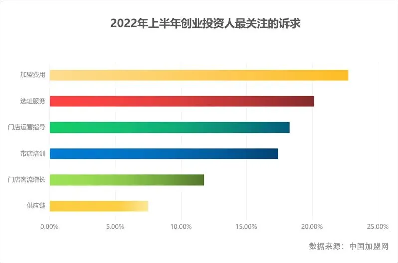 我们通过对加盟网2022年上半年创业投资人在加盟过程中所需诉求数据样本进行分析发现,在加盟过程中创业投资人最关注的诉求分为六大类,分别为加盟费用,选址服务、门店运营指导、带店培训、门店客流量增长以及供应链。