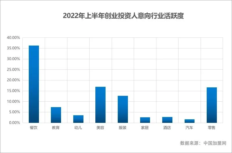 整体来看,2022年上半年虽然餐饮行业遭到严重冲击,但依旧是关注度最高的行业,其他行业如教育、零售、美容,投资人活跃度呈现不同程度的下滑态势。值得一提的是,作为传统行业的服装行业,投资人活跃度并未出现较大波幅,成为2022年上半年仅次于餐饮的第二大创业投资人关注领域。