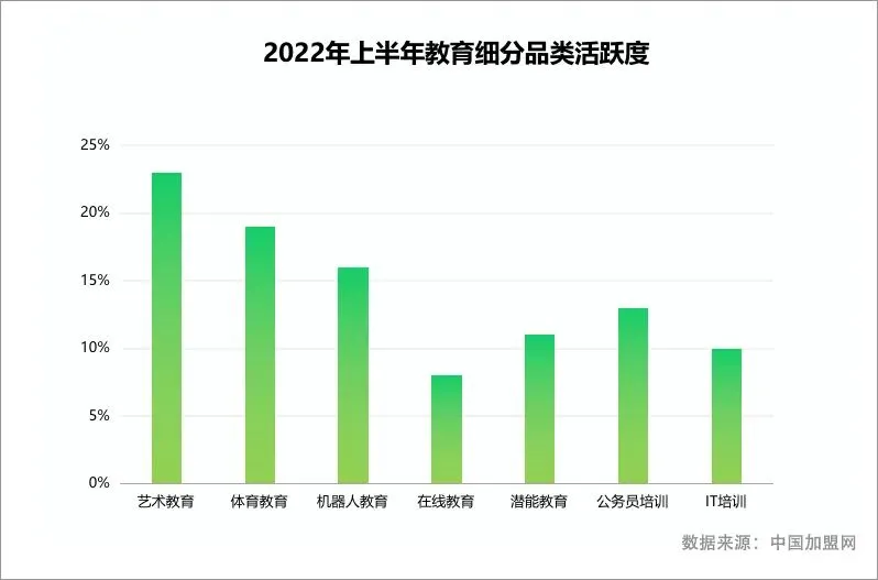 2022年上半年,从教育加盟的细分品类来看,素质教育加盟中艺术教育加盟、体育教育加盟、机器人教育加盟活跃度最高,成为创业投资人关注的教育加盟投资主流。