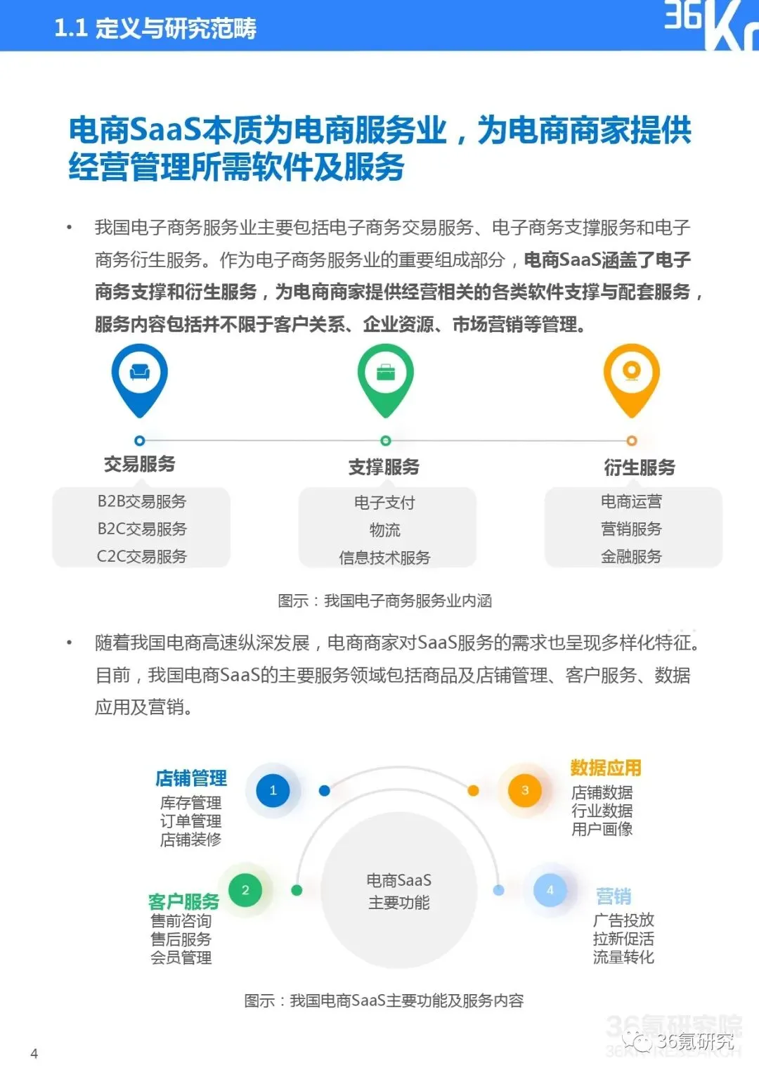 电商SaaS为电商商家提供经营相关的各类软件支撑与配套服务。目前,我国电商SaaS的主要服务领域包括店铺管理、客户服务、数据应用、营销四大类。