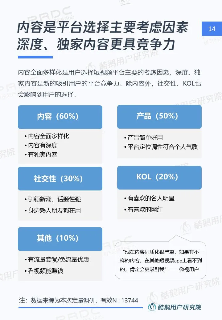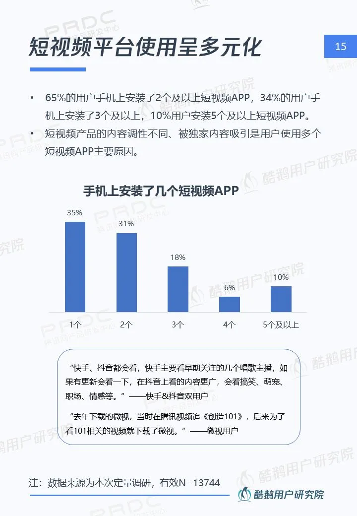 65%用户安装2个及以上短视频APP,内容全面多样化是用户选择短视频平台主要考虑因素,深度、独家内容正成新的平台竞争力。