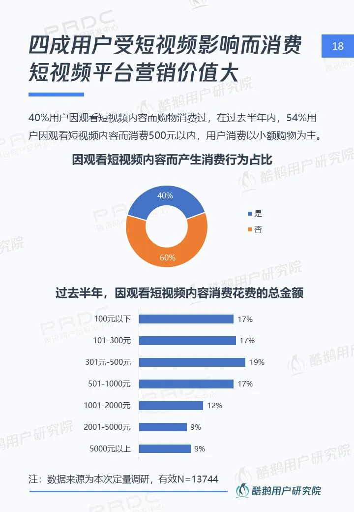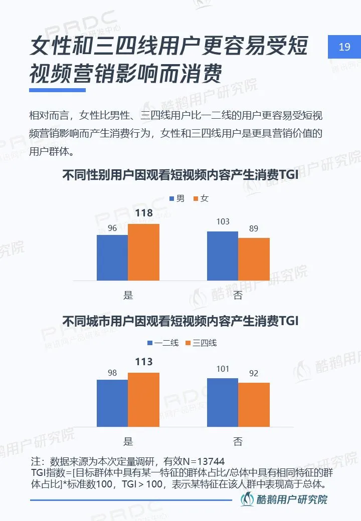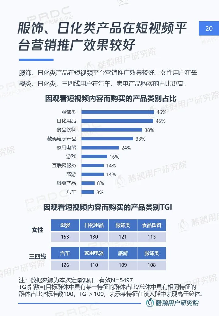 四成用户因观看短视频内容而产生消费,女性和三四线用户更容易受短视频营销影响而消费,是更具营销价值的用户群体。