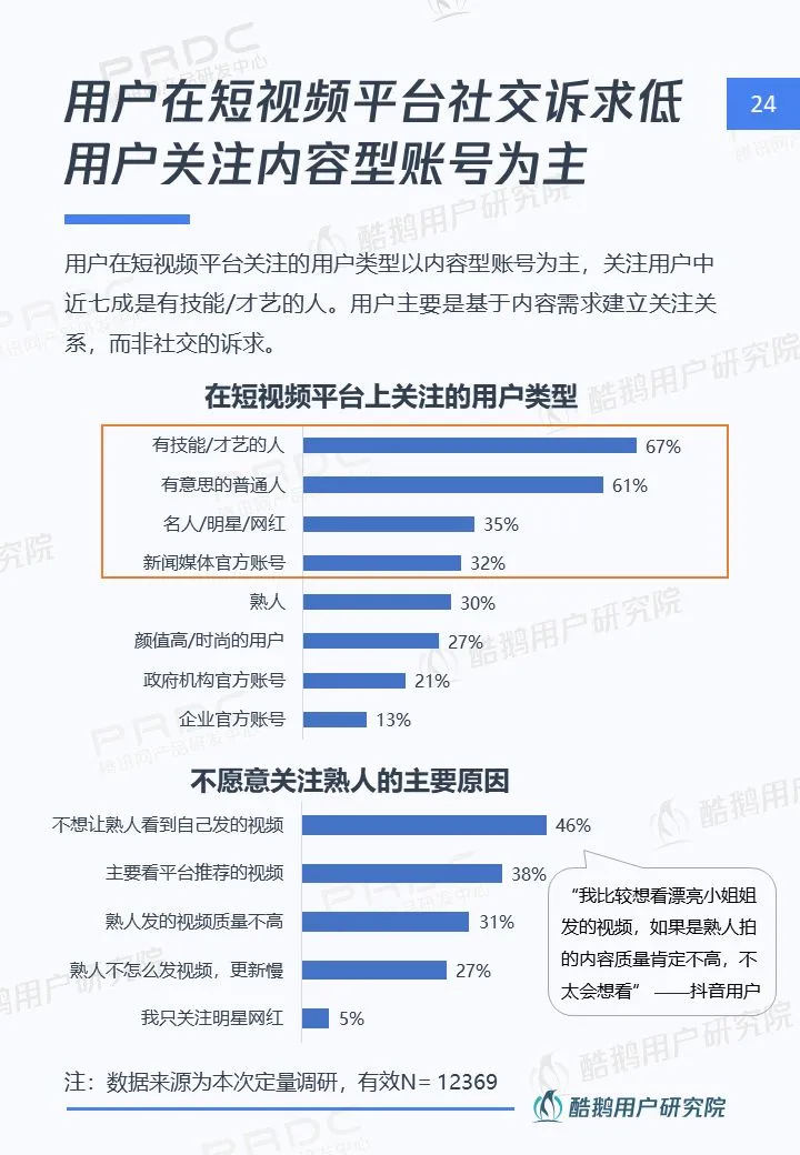 3、用户在短视频平台社交意愿低,短视频用户社交更多是基于内容的互动,而非社交关系互动