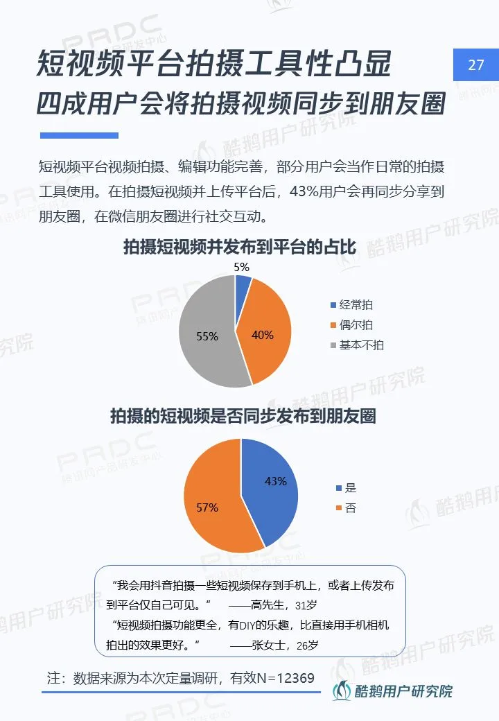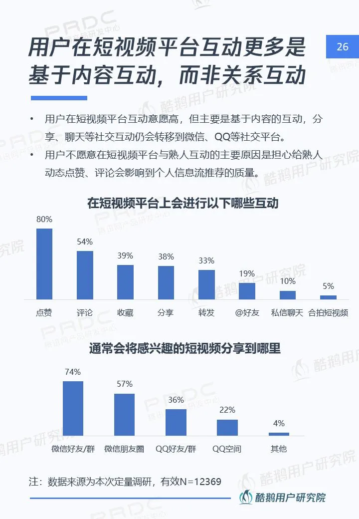 用户在短视频平台社交意愿低,用户之间的互动主要是基于内容层面的互动,私信聊天、分享等社交需求仍会转移到微信等社交平台满足。