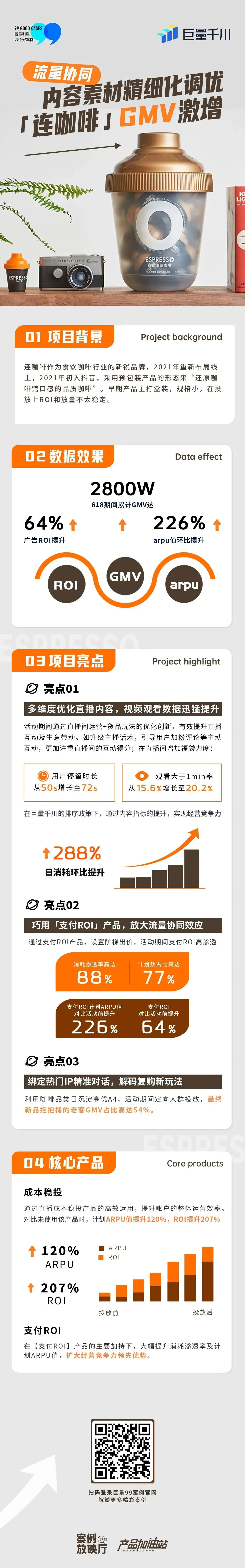 在具有协同分领先优势的情况下,连咖啡以优化调整【支付ROI】为核心手段,以提升计划ARPU值为主要目标,在今年618期间,通过巨量千川的投放、直播间与货品策略的精细化运营,实现了GMV、ROI等关键数据的大幅增长。