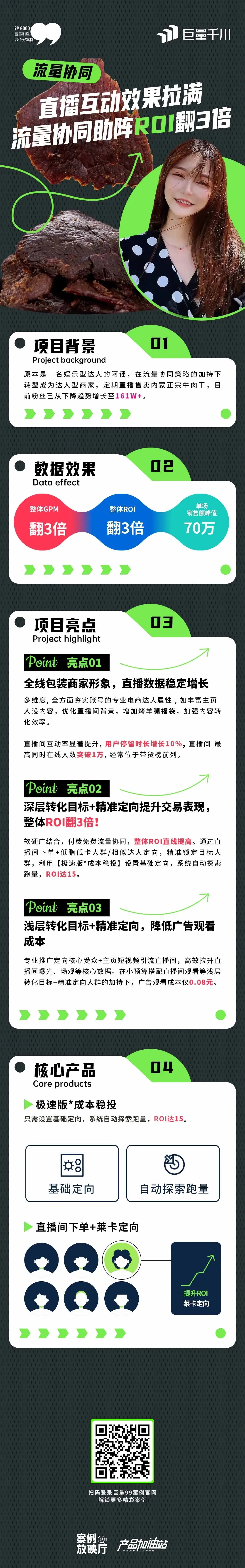 比如,在第三个案例中,经营竞争力诊断结果为「偏低/可优化」的草原姑娘阿谣,就是根据诊断后的解决方案因“病”失策,有针对性的提升投放GPM和内容互动指标,如短视频播放、直播间互动数据等,同时巧用「极速版*成本稳投」,提升直播间、短视频曝光转化力及流量协同效益,大大增强了投放竞争力和投放效果,最终取得了GMV翻3倍的喜人战绩。