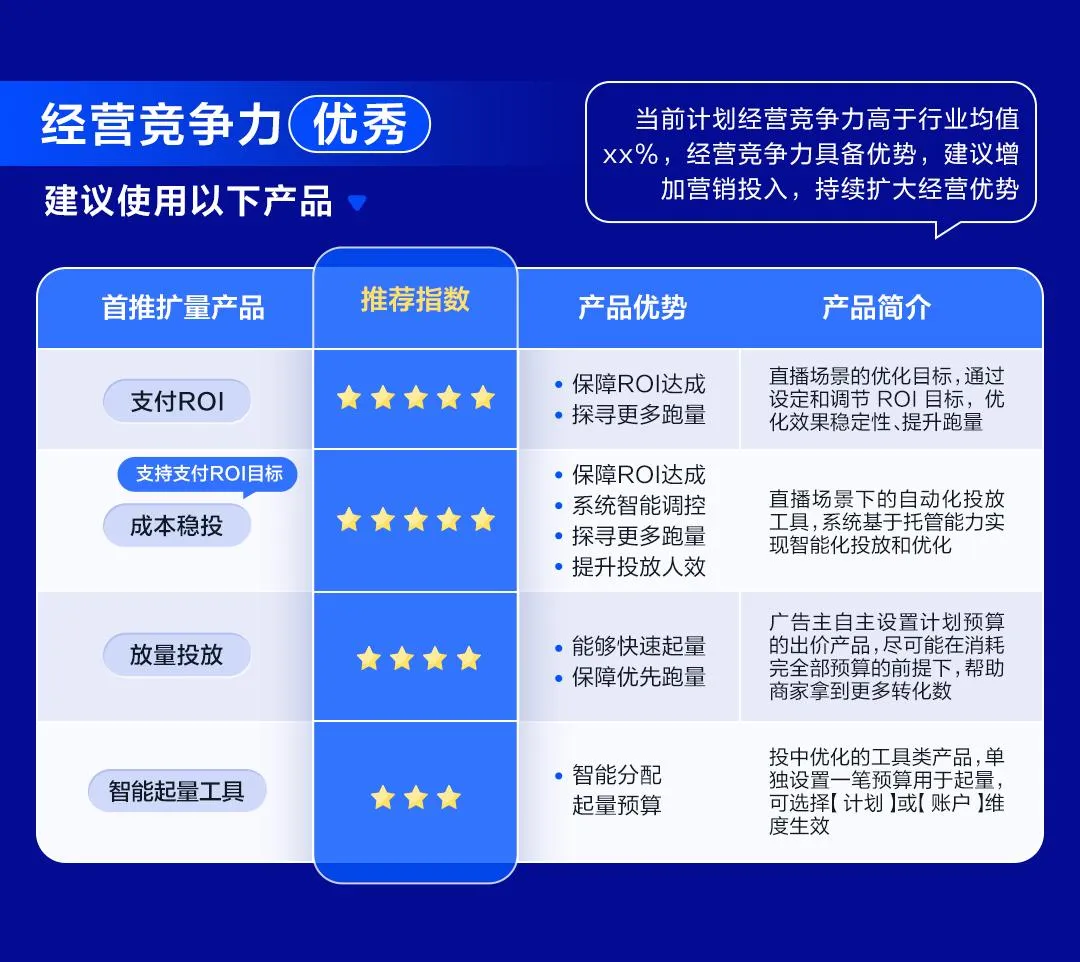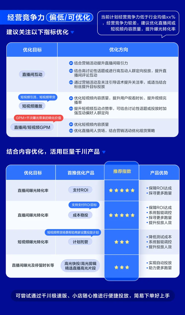 今年6月初上线的经营竞争力产品,就是充分洞察了商家在投放实战中遇到了许多“不得其解”的问题。例如有的商家不了解付费流量和自然流量的价值与关系,无法令两者有效协同;有的商家缺乏对协同要素,即自身内容质量和交易能力的清晰判断;还有的商家可能擅长创作优质内容但不会营销,或是懂得营销却做不好内容,抑或是内容和营销都具备优势,但不会借力广告放大生意规模。