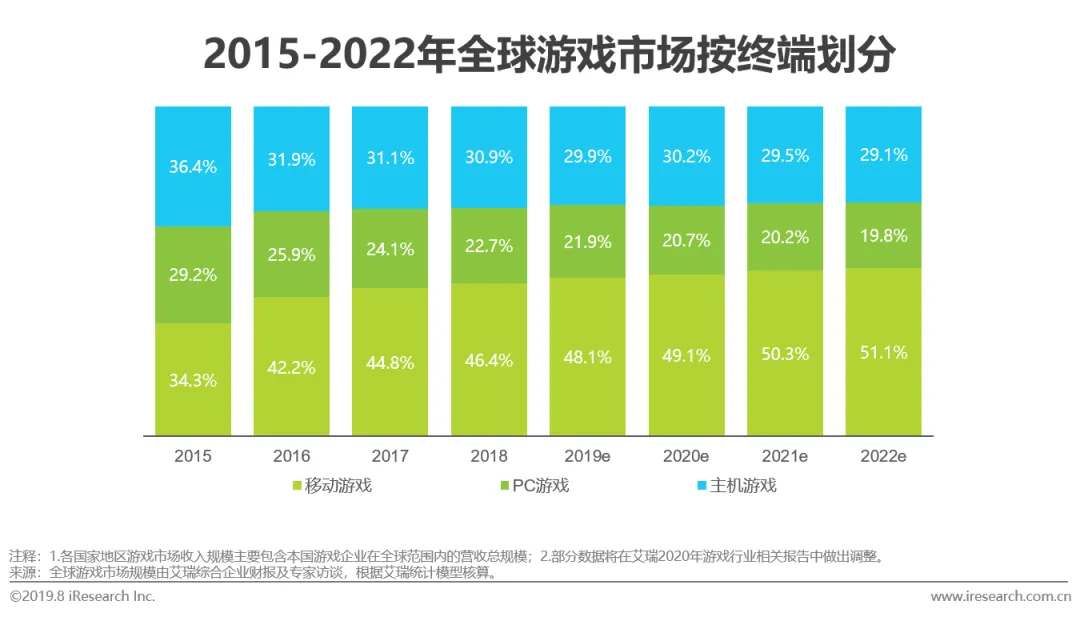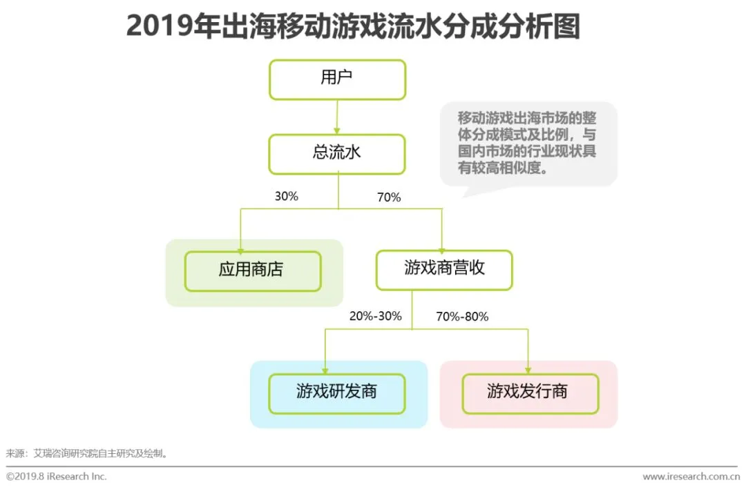 概述--在移动游戏出海市场,游戏厂商的营收仍主要来源于用户的游戏买断费或游戏内道具消费。而行业平均的流水分成情况如右图所示。其中,在自研自发的模式下,所有的“游戏商营收”将全部归为游戏研发商所有。应用商店--以APP Store及Google Play为代表的海外移动应用商店会在用户的游戏付费行为中进行第一轮流水分成,其分成比率一般为30%。研发商--游戏研发商主要负责游戏的设计与开发工作,工作任务相对单一。一般而言游戏研发商能够获得游戏流水总分成中的15%-20%。发行运营商--游戏运营商主要负责游戏在海外地区的发行及运营工作,该类工作往往具有较高的难度,并能够直接影响游戏的最终营收情况。因此,游戏研发商在整个合作中的流水分成相对较高,一般能够获得50%-65%的流水收入。2018年,全球游戏市场总规模达8093.9亿人民币,同比增长5.8%。其中,移动游戏、PC游戏及主机游戏分别占据市场总份额的46.4%、22.7%与30.9%。与前几年相比,全球整体移动游戏的市场规模占比在近三年中增幅明显。未来,随着5G、云服务等高新技术的不断发展,PC电脑在硬件性能上的不可替代性将被进一步削弱,移动设备有望在一定程度上替代PC电脑目前在硬核网络游戏市场中的霸主地位。因此艾瑞预测,到2021年,全球移动游戏市场总份额将占据整体游戏市场的50%以上。