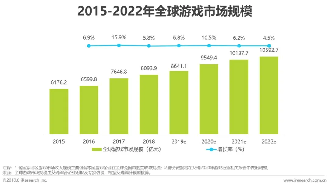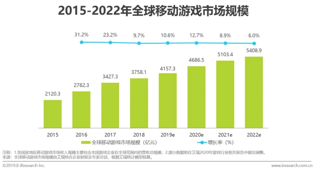 2018年,全球移动游戏市场规模达3758.1亿人民币,同比增长9.7%。随着市场在中、日等核心地区用户红利的不断减少,市场整体增速开始减弱。未来,在新兴游戏及东南亚等蓝海市场的助推下,整体行业仍有望保持相对稳定的增长态势。分地区来看,2018年中国移动游戏市场总收入占全球移动游戏总收入的36.8%,当之无愧地成为全球最大也是发展最快的移动游戏市场。与此同时,在中国移动游戏市场巨大的流量支撑下,中国移动游戏研发实力也在近几年得到了巨大的提升,以《刺激战场》《阴阳师》为代表的多款中国国产游戏产品已经证明了,中国头部移动游戏已经具备世界领先的产品水准。