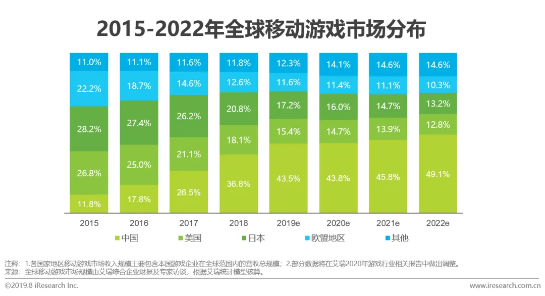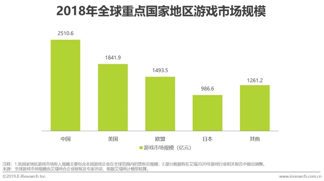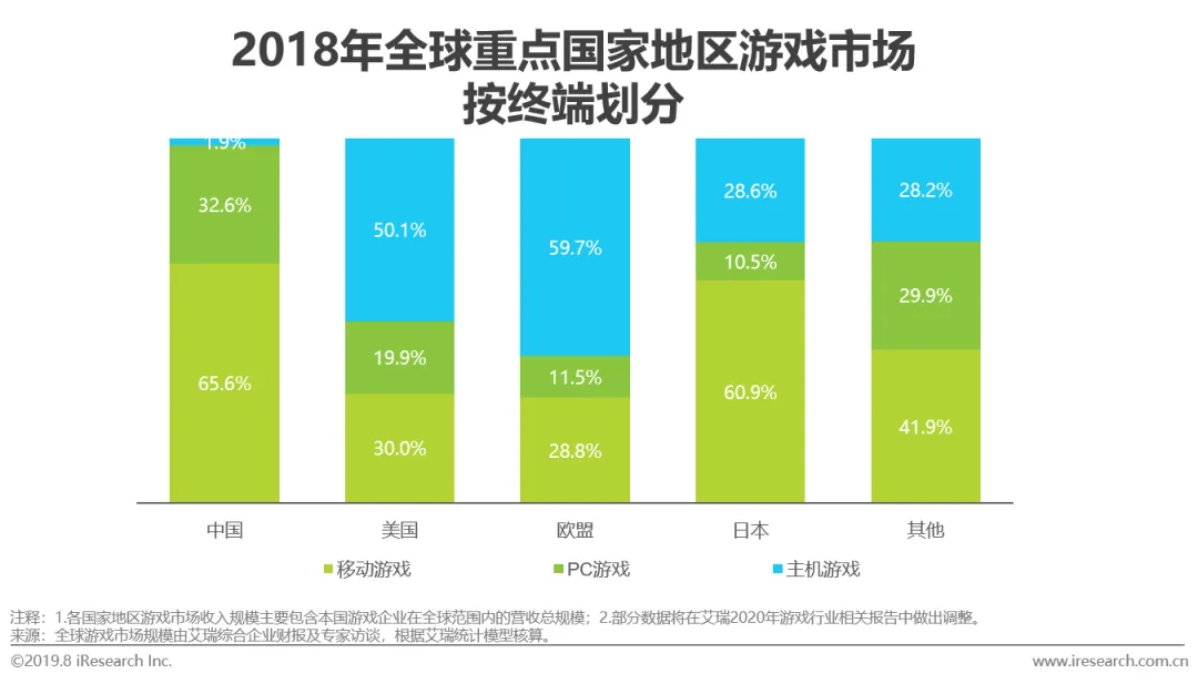 2018年,中国游戏市场全年收入达2510.6亿元人民币,市场总规模领先全球,而美国、欧盟及日本分列2到4位。数据显示,全球前四大游戏市场在细分游戏市场占比上的分布情况不尽相同。其中,移动游戏市场在中国与日本两国游戏市场中的占比均已高于60%,行业整体的发展空间相对有限。而在美国及欧盟地区,移动游戏市场的行业总占比尚不足30%。综合考虑美国及欧盟地区已经拥有庞大的游戏用户基数,智能移动设备及移动网络的普及率也较高。因此艾瑞认为美国及欧盟地区的移动游戏市场拥有在短期内高速增长的潜力,是未来值得关注的潜力市场。