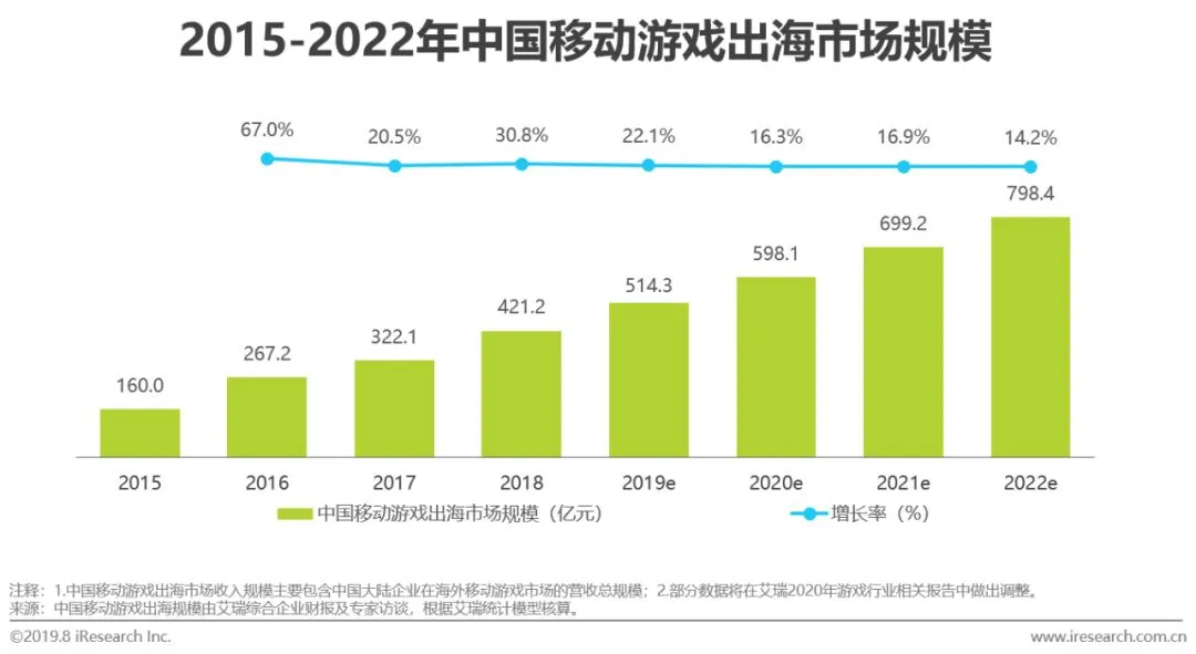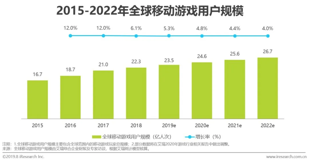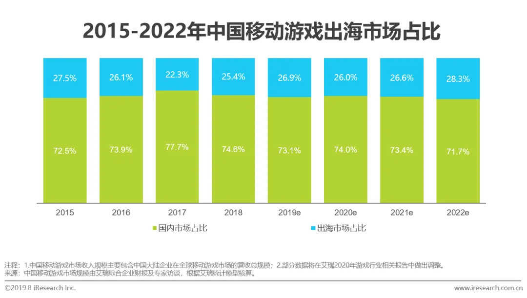 在移动互联网市场蓬勃发展的背景下,全球移动游戏市场经历了长达数年的高速成长。而在高速的成长过后,市场人口红利已逐渐进入瓶颈期。 2018年全球移动游戏用户规模达22.3亿人次,同比增长6.1%,用户市场整体增速相较往年有所下降。艾瑞认为,在市场多年的教育下,从智能手机的既有用户市场中已很难找到移动游戏的增量用户,而未来市场的增量用户将主要来自发展中地区的新进智能手机持有者,市场的潜在用户规模相较过去几年有所缩小。因此,行业未来的用户规模增速将趋于平缓,进入一个相对稳定的增长阶段。2018年中国移动游戏市场迎“出海热”,同比增速超30%受国内移动游戏市场监管方案调整的影响,我国本土的移动游戏市场发展在2018年出现了短暂的停滞。在此背景下,我国移动游戏厂商纷纷瞄准海外市场进行拓展。数据显示,中国移动游戏出海市场在2018年内的确获得了高速且有效的发展:2018年,中国移动游戏出海市场总营收规模达421.2亿元,同比增长30.8%,行业整体规模及增速均在2018年获得了显著的增长。此外,2018年中国移动游戏出海市场的营收规模占移动游戏市场总规模的25.4%,在行业“出海热潮”的带动下,其市占率相较2017年有明显增长。随着中国国内移动游戏用户红利的逐渐枯竭,游戏出海在未来几年仍将成为中国移动游戏研发商拓展增量市场的主战场。