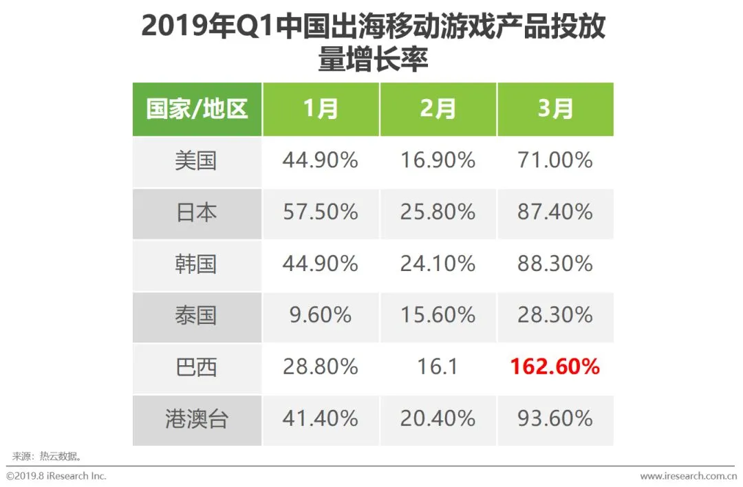 据热云数据统计显示,2019年1-3月,中国出海移动游戏产品在美国、日本、韩国等多个海外热点市场中的投放数量均获高速增长。其中仅2019年3月,中国出海移动游戏在巴西市场的产品投放的增速就高达162.6%。此外,在东南亚的泰国市场,中国企业的投放力度也正在逐月递增。海外发展中地区市场正成为中国游戏厂商近期着重布局的市场板块。