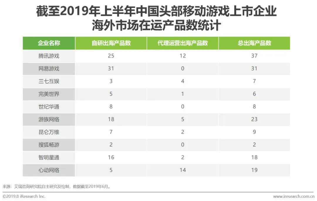 2018年起,在市场背景的推动下,我国头部移动游戏企业纷纷开始布局海外。下表中统计了截至2019年6月,我国头部移动游戏上市企业在海外应用商店(除中国大陆及港澳地区)仍在运营的产品总款数。