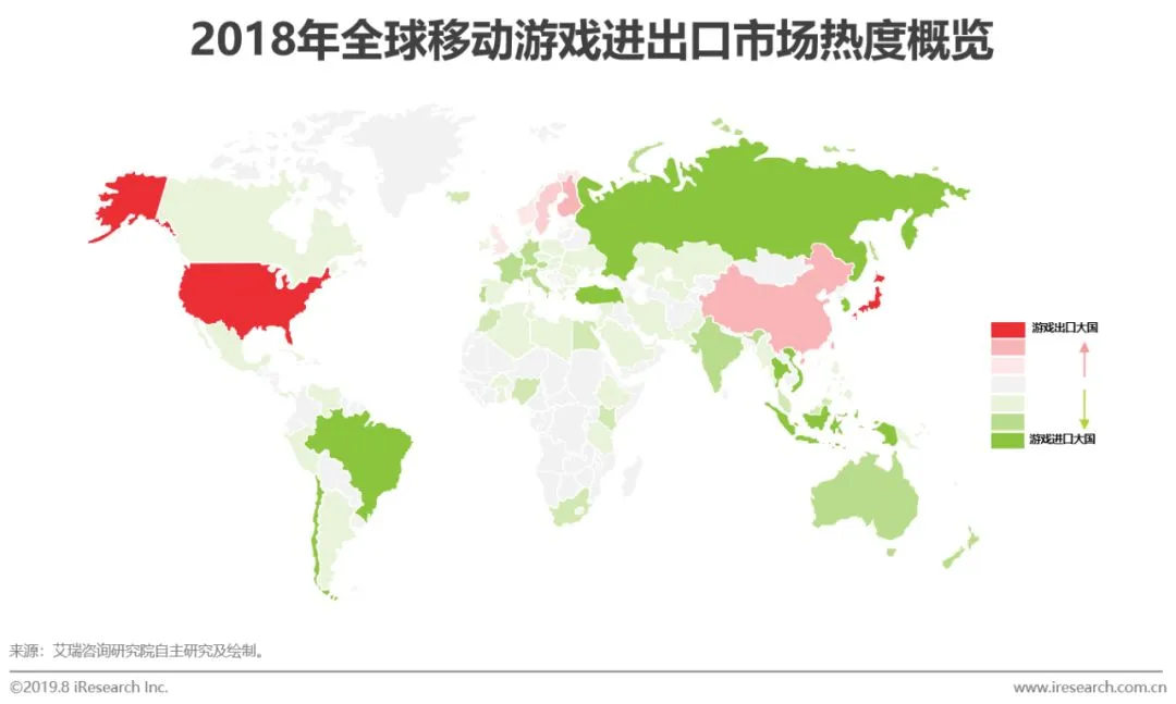 在下图中,色块较深的地区往往代表着移动游戏进出口贸易较频繁的地区。可以发现,全球范围内移动游戏进出口贸易热度与该地区智能手机普及率是具有较高相关性的。其中,由于日本、美国、中国及北欧等地区的移动游戏应用开发实力领先且产品发行线遍布全球,因此这些国家在移动游戏出口市场的表现往往较为亮眼。而如韩国、俄罗斯、土耳其、巴西等地区,虽然本国自身的移动游戏研发能力有限,但强大的市场需求吸引了大批海外游戏厂商入市拓展,在海外游戏产品的帮助下这些国家同样能够将本地市场做大做强。2018年中国移动游戏海外区域热度总览