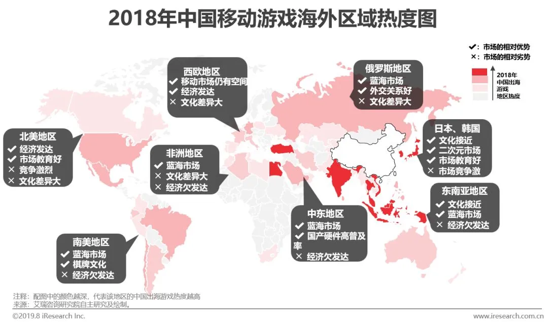 正如前文所述,移动游戏出海业务的发展空间受宗教文化、政治外交和经济发达程度等多重因素影响。而截至目前,中国移动游戏出海业务在海外各地区的发展热度大致符合市场规律。其中,东亚、东南亚及印度等地区由于文化与中国最为接近,因此对中国制作的游戏产品的接受度也是最高的。而北美地区、欧洲部分地区及澳洲地区在市场极高的智能移动设备及网络普及率的支持下,同样成为了中国游戏产品的重要出口目标。