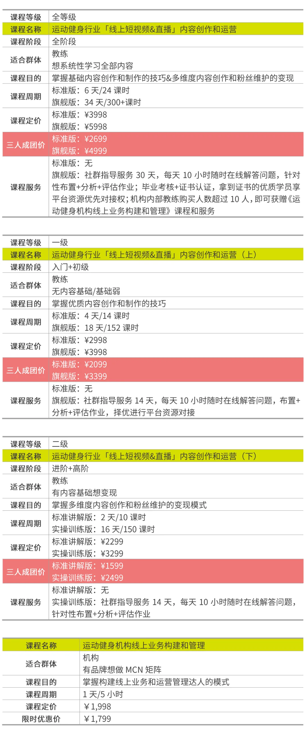 ***机构内部教练购买运动健身行业「线上短视频&直播」内容创作和运营课程人数超过10人,即可获赠《运动健身机构线上业务构建和管理》课程和服务。