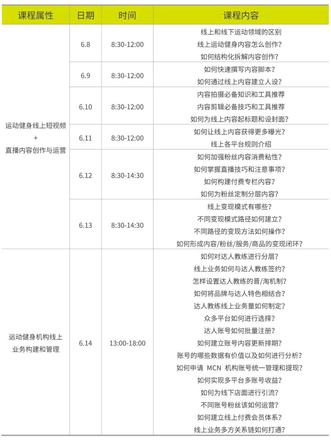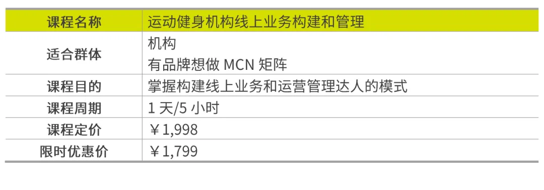 我们也专门针对运动健身机构推出了「线上业务构建和管理」课程,帮助大家掌握构建线上业务和运营管理达人的模式。
