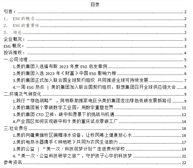 1 美的集团在2022年发布了自己的ESG成绩单,展示了在绿色战略、数字化转型、共建绿色供应生态体系、技术人才助力科技领先、多维度履行社会责任等方面的进展和成果。