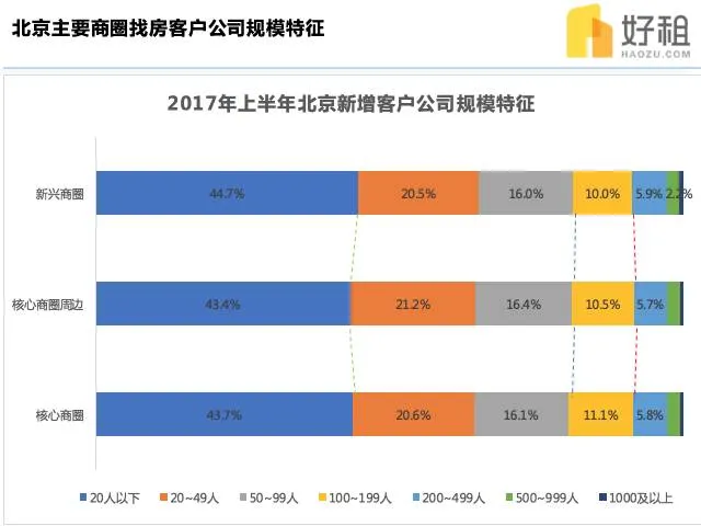 小微企业的人数,大多均在100人以下。核心商圈公司规模在100-199人,核心商圈周边公司规模20-99人,新兴商圈为20人以下或200人以上。核心商圈周边成为小微企业的首选之地。