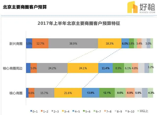 核心商圈周边聚集大量的20-99人规模的公司,300平以下的需求面积,融资企业聚集,资本活跃,一切的数据均符合小微企业的特性,可见,核心商圈周边受到小微企业偏爱——价格上低于核心商圈,交通及其他便利度又高于新兴商圈。核心商圈客户预算租金在4元/月/平米以上,核心商圈周边为3-4元/月/平米,新兴商圈在3元/月/平米以下。