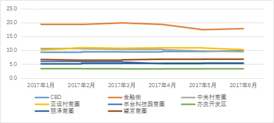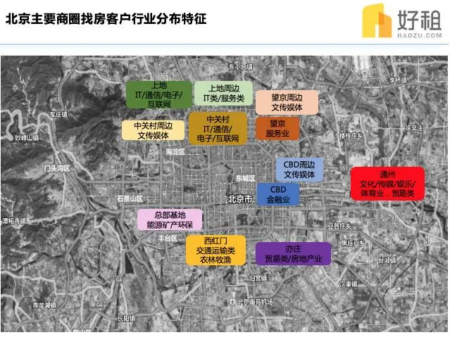 据好租数据显示,2017年上半年,望京、CBD国贸、中关村和上地为四大租赁热区。上地和中关村区域主要以IT、通信、电子、互联网行业为主,CBD国贸依然以金融业为主,望京区域除了互联网科技行业外,服务业也聚集于此。