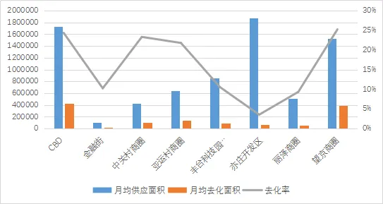 2017年上半年,亦庄开发区、CBD及周边区域保持了最大的月平均供应面积,但在去化方面呈现出两极分化的态势。亦庄开发区的去化依旧呈现出较为缓慢的态势。上半年,望京商圈及周边区域表现抢眼,去化率最高并超过了CBD区域。