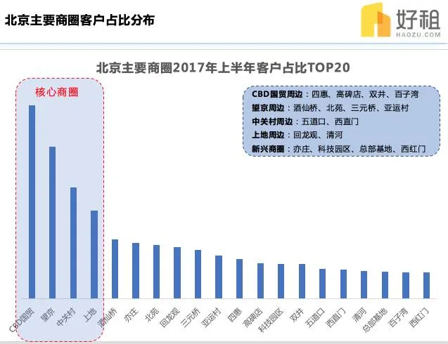 2017上半年,通过一系列住宅调控、商办调控,一方面控制房价进一步上涨的风险,另一方面,伴随着雄安新区的设立,以及对开墙打洞的治理,专业市场的疏解等措施,共同促进一个大目标:那就是围绕“四个中心”定位,疏解非首都功能,建设国际一流和谐宜居之都,发展京津冀都市圈。而望京,拥有良好的地理位置,被誉为北京的窗口,这一年来发展迅猛。据好租数据显示,北京主要商圈客户占比分布,望京已经位列于CBD之后,未来的几年里,不知道望京是否会出现超越国贸CBD成为北京第二个CBD。
