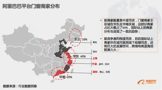 从企业规模来看,我国门窗行业以小型企业为主。目前我国门窗行业整体商家数31000左右,商家地域分布主要在华东及华南片区。阿里巴巴国际站上的门窗商家也主要集中在华东及华南片区,主要城市在上海,宁波,深圳,佛山区域,但是平台商家的数量相比线下整体规模,还有非常大的市场潜力,商家依托阿里巴巴国际站探索出海机会,仍然有巨大空间。