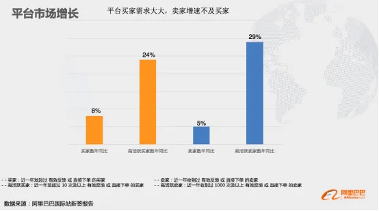 国际站目前门窗行业买家数及卖家数的增长对比来看,买家的需求大于卖家供给,目前平台整体供应相对不足,商家入驻平台占领海外买家市场仍存在巨大的商机,并且从平台的高活跃卖家数来看,卖家的商家转化能力也非常厉害。
