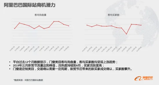 平台过去12个月数据显示,门窗类目客均询盘量,客均买家数均呈现上涨趋势并且在2019年三月新贸节流量达到峰值,且热度持续到4月,买家活跃度高。但是由于门窗是定制类目,交易确认需要一定周期,新贸节后带来的新买家成交确认,买家数攀升。