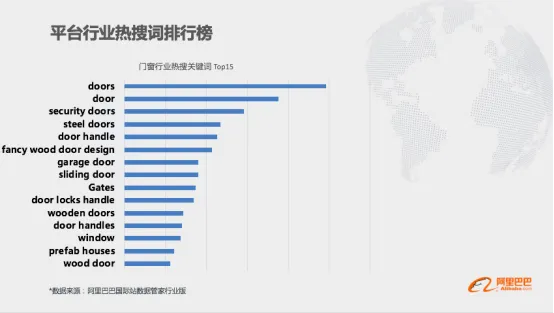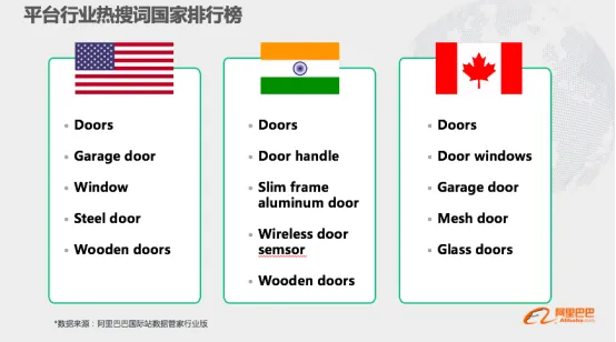 门窗的平台的买家主要来源是:美国,印度,加拿大,澳大利亚,英国,尼日利亚,沙特,以下针对来源最大的3个国家呈现主要的买家热搜词,从而商家可以针对性结合自己的生存优势及供应链配套能力,综合调整平台品类组合,设置关键词跟看自己产品的类目属性归属,保证流量导入。