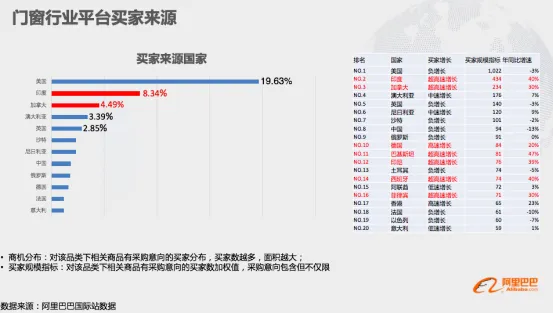 国际站上的门窗行业的买家主要是来自欧美国家,主要是北美地区,另外买家高速增长的还有印度,尼日利亚,印尼等高速增长国家国家,传统市场与新兴市场机遇同在,特别是针对现在贸易战,拓展其他新兴国家市场尤为必要。