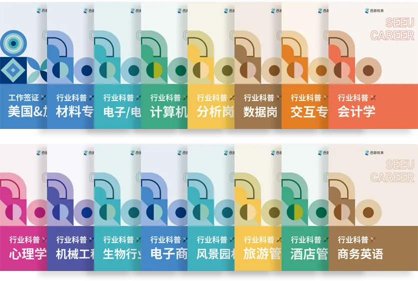 计算机、电子工程、会计、金融、材料科学、统计学、数据科学、商业分析、机械工程、生物医学、经济学、金融工程、市场营销、建筑设计、法学、传媒等16个主流专业的《留学生高潜力专业就业全景指南》行业科普卡片。